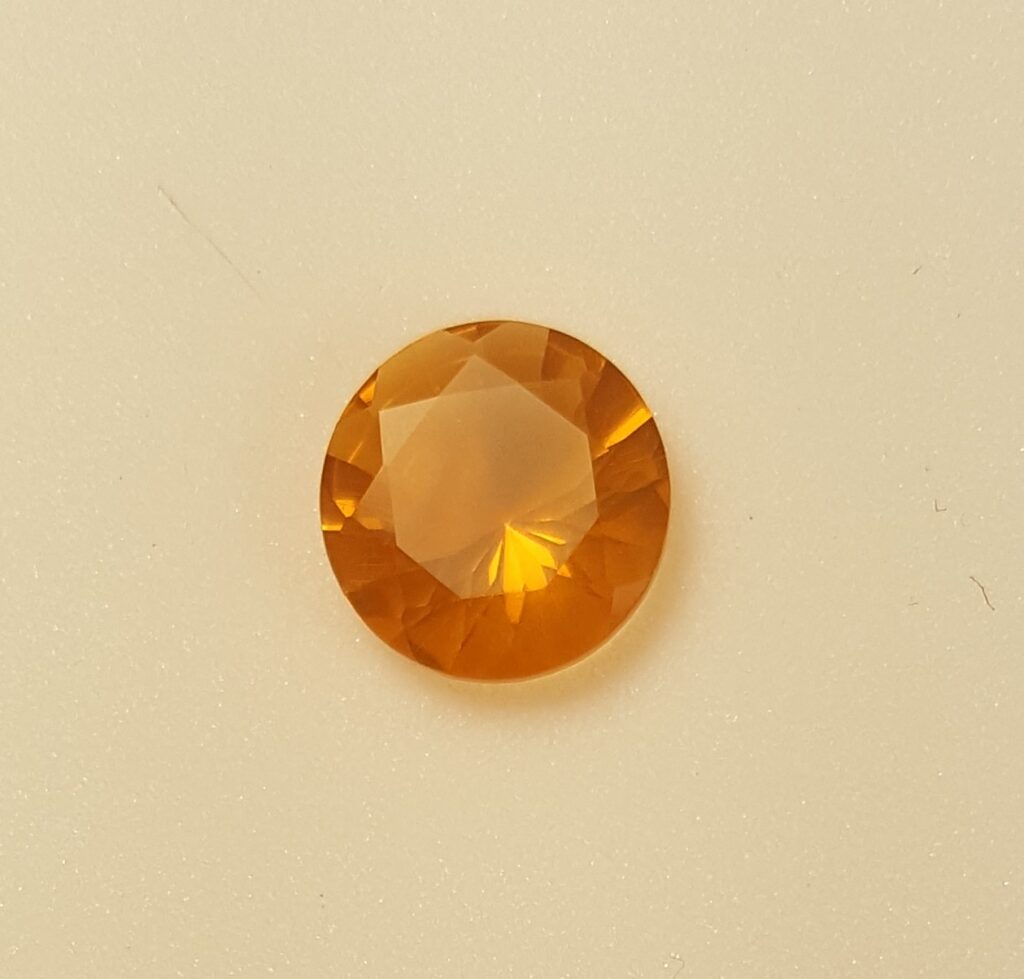 DD 238. MEXICAN FIRE OPAL. Bright orange and very flashy.  .90 ct. 7 mm Rd. $78. DD241 (to the right) matches this one.