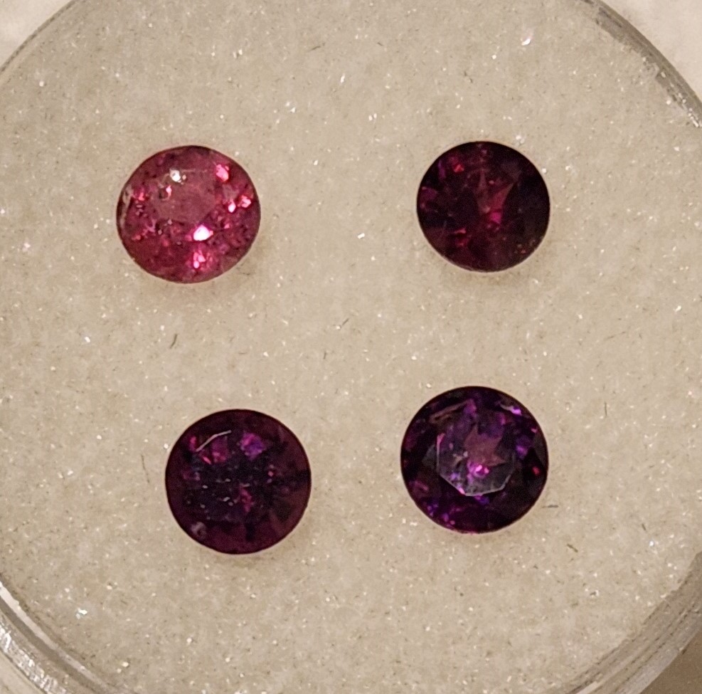 3390. GARNET MIX. as follows. A. Rhodolite Garnet. 4.35 to 4.67 mm ave. 4 avail at $8 ea. B. Mozamb. Rhod. 5 mm .70 ct ave. 4 at $12 ea. C. Rhod Mixed. 4 to 6 mm. 12 avail at $6 ea. D. Red Garnet. 5.4 – 5.5 mm. 4 at $10 ea. E. Rhod Trils 5 mm 2 at $10 ea. F. Red Garnets. 10 x 8 mm Ovals. Nice flashy red. 2 avail at $18 ea.