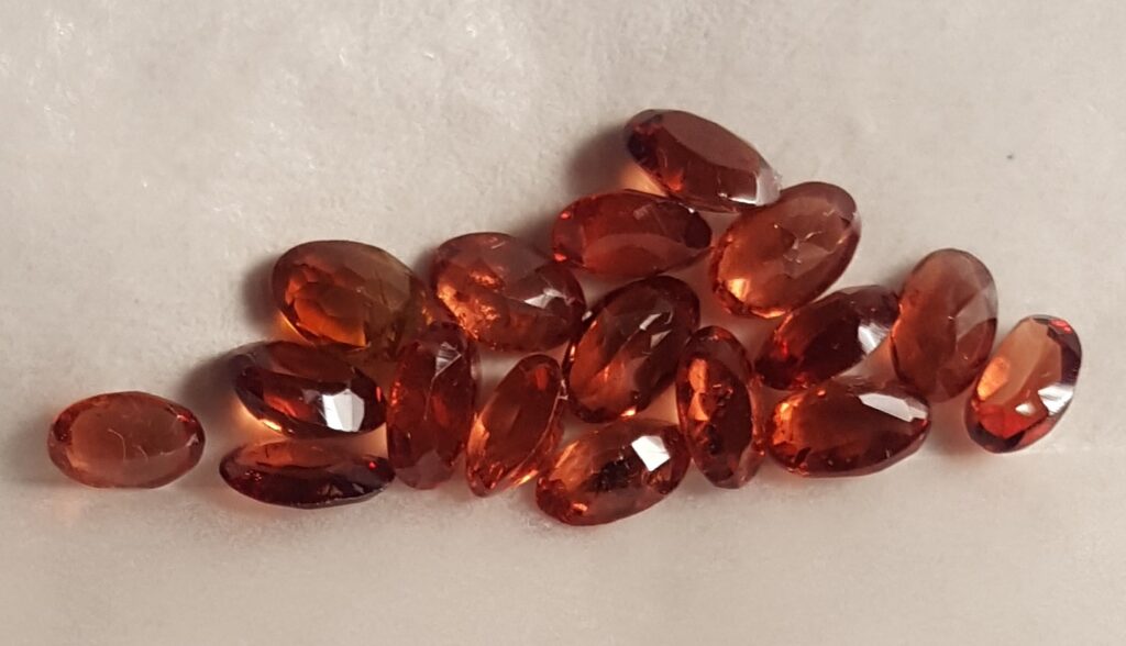 *3088. GARNET. Ov. 6 x 4 mm Ovals. Good color and good clarity. Minor inclusions in a few. 30 avail at $6 ea. 2612. SPESSARTITE GARNET. Ov. Strong orange color. Very nice color and cut. 6 x 4 mm ovals. 12 avail at $16 ea. Sorry about the picture. It is a bit blurry. Will try to get a better one up. *1493B. RHODOLITE GARNETS. Ov. 6 x 4 mm. Lovely raspberry. Nicely faceted & flashy. $18 ea. 4 avail.